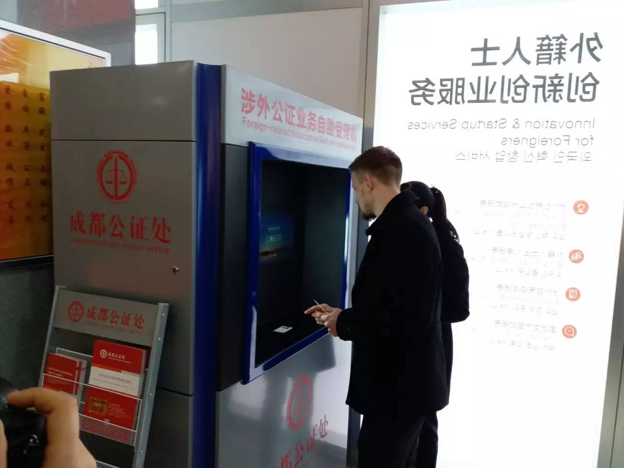 2017年02月22日,“家在成都·菁蓉創(chuàng)享”2017年領(lǐng)事官員雙創(chuàng)體驗(yàn)活動(dòng)在成都舉行。作為中心配套引進(jìn)的涉外法律服務(wù)項(xiàng)目,成都公證處“涉外自助辦證”服務(wù)受到了中外嘉賓的特別關(guān)注。